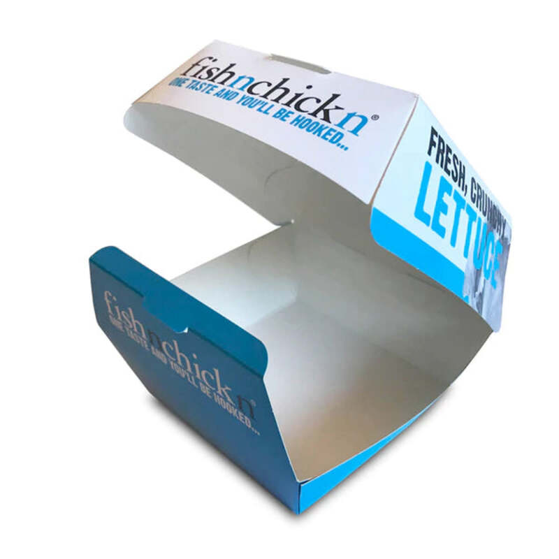 Custom burger boxes printed with your very own unique branding all over. All our printed burger boxes are manufactured in the UK. Produced using food grade inks and 400 micron / 235 gsm premium cardboard. Printed cardboard burger boxes are sure to strike a cord with your customers no matter if they are ordering for home delivery or picking up from your restaurant or food stall. Our personalised burger boxes have been designed to give optimum protection whilst offering large real-estate to print your on off design on to. This gives multiple options to include marketing material and offers printed directly onto your cardboard burger boxes. Custom burger packaging are supplied nested so take up minimal space when storing. Bulkbuy Packaging's Burger boxes with logo on offer great protection and moisture evacuation so your burgers will still be fresh when its time to eat them!