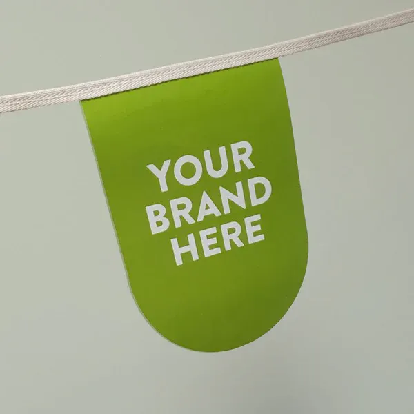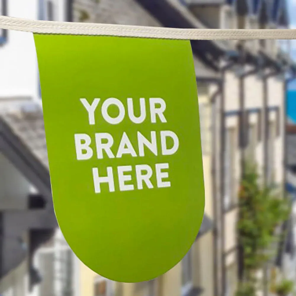 Our printed bunting stitched to natural unbleached cotton webbing is 100% eco friendly, furthermore it is fully recyclable. This makes it a great choice when looking for printed bunting that meets your sustainability goals. Modern look custom printed bunting to promote your brand to the full. Our eco friendly bunting is produced in virgin or recycled paper pennants, these are sewn to natural cotton webbing to deliver the latest in high quality, sustainable bunting perfect for your promotion or event. Price includes up to 3 different designs.All our printed paper bunting is ethically sourced, making it a great choice for customers who need assurance about the place of manufacture and safety of their products. Sold in 10m lengths. Unbleached cotton or white cotton webbing.