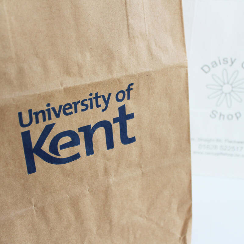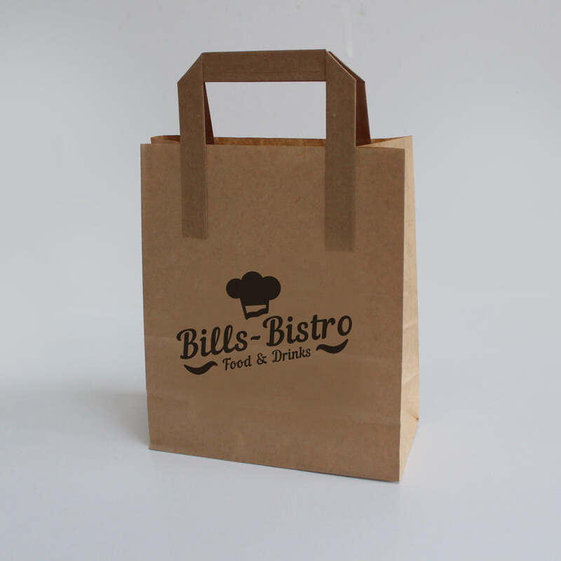Bespoke digital printed paper bags with handle (external tape handle) printed in house by us. Bulkbuy Packaging supplies many catering and retail business' high-quality printed paper bags. Our digital printed bags are available in white or brown kraft bags. We understand low volumes, fast turnaround and brand image are important to you. This is why our digital printed paper bag range offers a large print zone in the middle of the bag, printed in full colour CMYK - This is why our digital overprinted bag range offers a large print zone in the middle of the bag, printed either 1 or 2 sides - this keeps cost down and production times quick.. Branded takeaway packaging is great for helping your brand stand out, and keeping up with changing marketing / promotions. No matter if its for your coffee shop, cafe, hotel or promotional event. 100% recyclable and are made from paper sourced from FSC approved and managed forests. Suitable for takeaway food and retail.