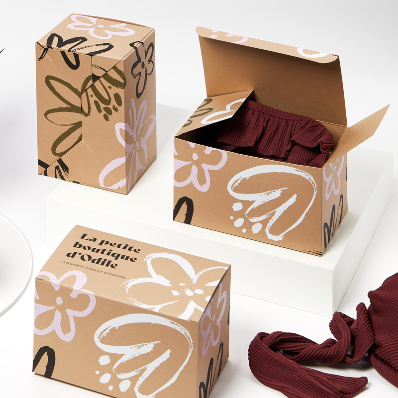 The first step in configuring your promotional boxes is to choose the perfect dimensions to fit your products. Choose from 11 different widths ranging from 4 cm to 20 cm. The depth will either be automatically defined based on your chosen width or in some cases, you may be offered a variety of depths and formats for your boxes.