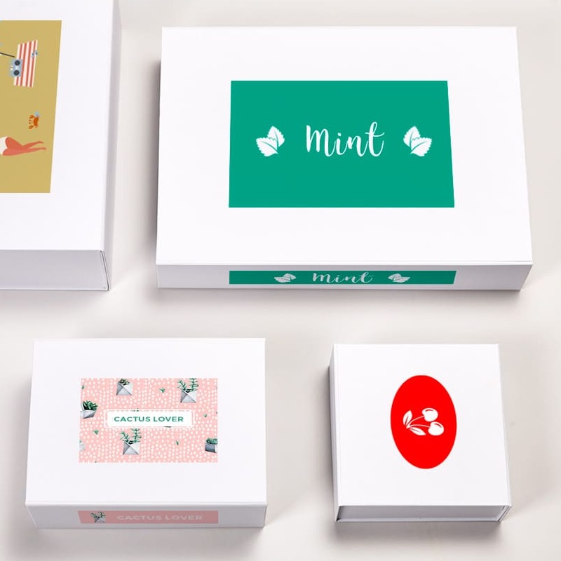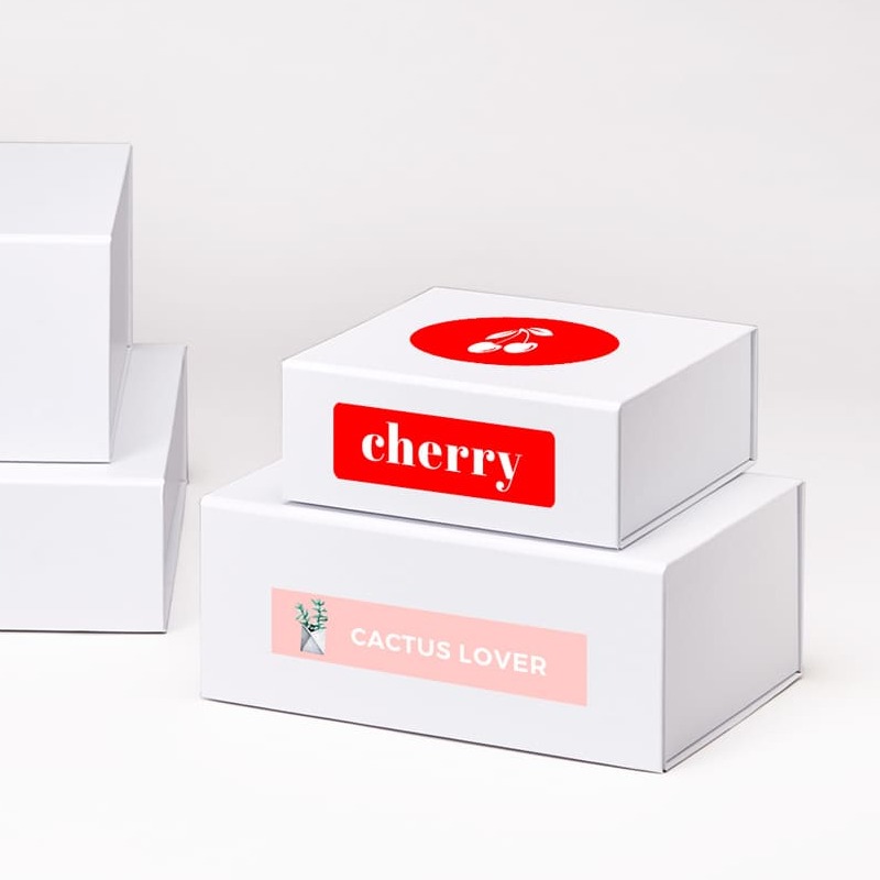 The snap shut boxes are made from 3 mm paperboard coated with white laminated paper. There are four formats available (18 x 18 x 7 cm, 25 x 18 x 10 cm, 35 x 25 x 12 cm and 42 x 30 x 8 cm) so you can find the right match based on the size of your products. There are two concealed magnets on the lid, providing an easy-close fastening that lasts a long time and keeps items secure.