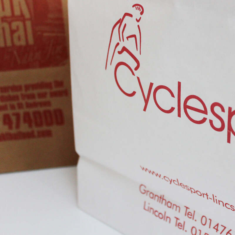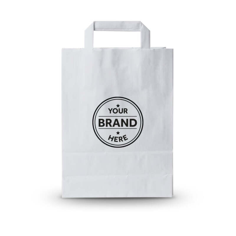 Bespoke printed paper bags with handle (external tape handle) printed in house by us. Bulkbuy Packaging supplies many catering and retail business' high-quality printed paper bags. Our in house digitally printed bags can be printed in full colour CMYK. We understand low volumes, fast turnaround and brand image are important to you. This is why our digital overprinted bag range offers a large print zone in the middle of the bag, printed either 1 or 2 sides - this keeps cost down and production times quick. Branded takeaway packaging is great for helping your brand stand out, and keeping up with changing marketing / promotions. No matter if its for your coffee shop, cafe, hotel or promotional event. 100% recyclable and are made from paper sourced from FSC approved and managed forests. Suitable for takeaway food and retail.